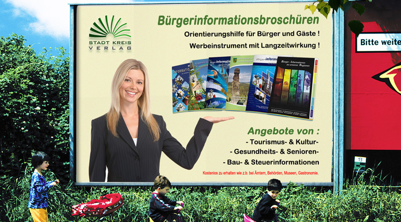 Als Dauerwerbeträger sind Bürgerbroschüren, Informationstafeln sowie Faltpläne ständig bei Ihren Nutzern präsent.